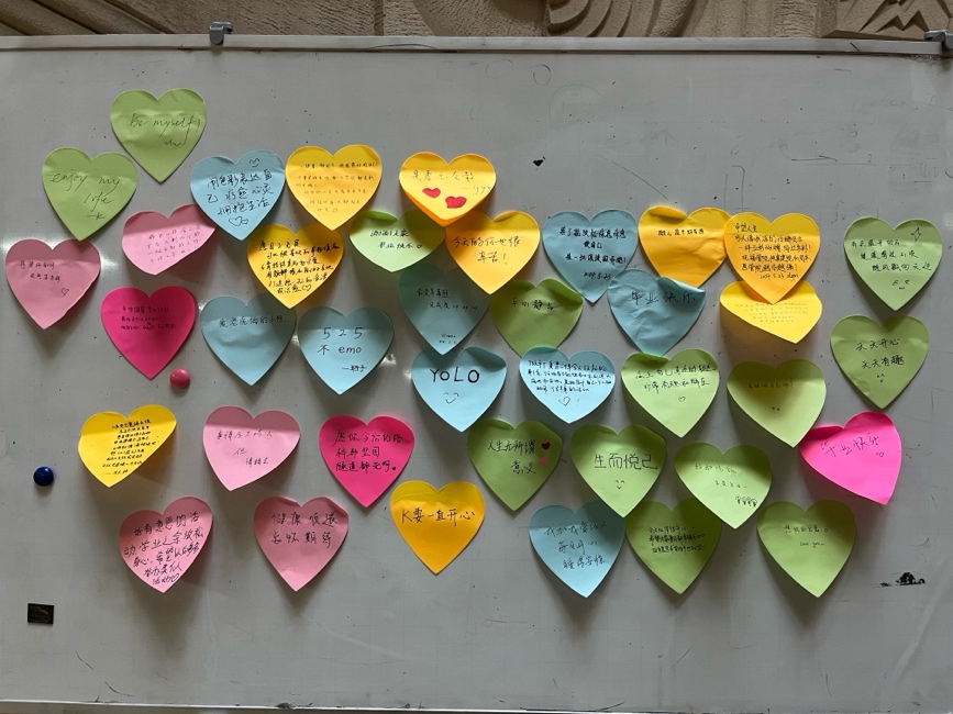 尤为值得一提的是“阳光心语墙”环节,它成为了本次活动的点睛之笔。在手绘完成后,每位同学都会在特设的心语墙上留下自己的寄语或感悟。墙上贴满了五彩斑斓的便签纸,每一张都记录着一个故事,一份心情,或是一句鼓励的话。这里,成了一个无声却充满力量的情感交流平台,让每个人都能感受到来自他人的理解与支持,有效地缓解了同学们的心理压力,促进了心理健康意识的普及。
