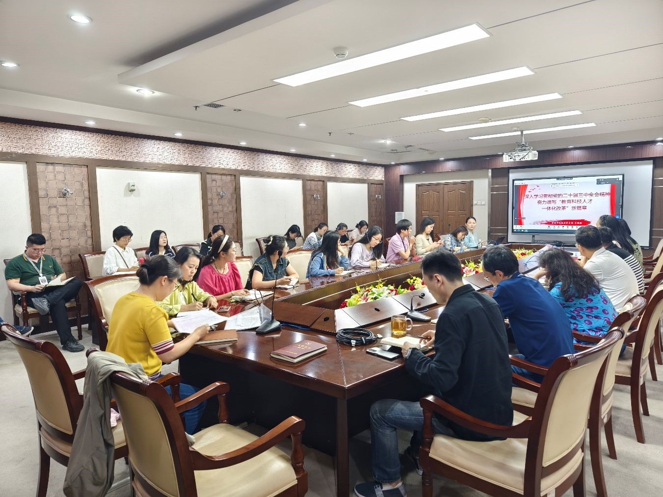 会议伊始,支部党员李田甜同志以“深入学习贯彻党的二十届三中全会精神,奋力谱写‘教育科技人才一体化改革’新篇章” 为主题,从回顾改革开放以来党的历届三中全会的历史背景、主要内容和重大决策出发,全面介绍了党的二十届三中全会的重大意义,系统阐释了《中共中央关于进一步全面深化改革、推进中国式现代化的决定》的丰富内涵、精神实质和核心要义,解读了《决定》关于统筹推进教育科技人才机制体制一体改革的一系列新思想、新观点、新论断,并结合学校发展实际,呼吁大家积极融入新时代改革大潮,为高质量发展和中国式现代化贡献挺膺担当。