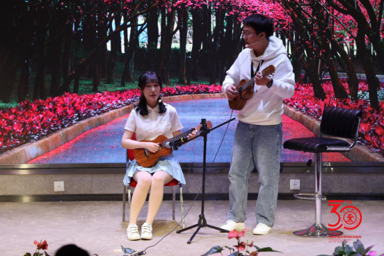 MEM9097&9098班的米洁、王建豪带来的尤克里里弹唱《心愿便利贴》充分彰显了管院学子的青春洋溢。