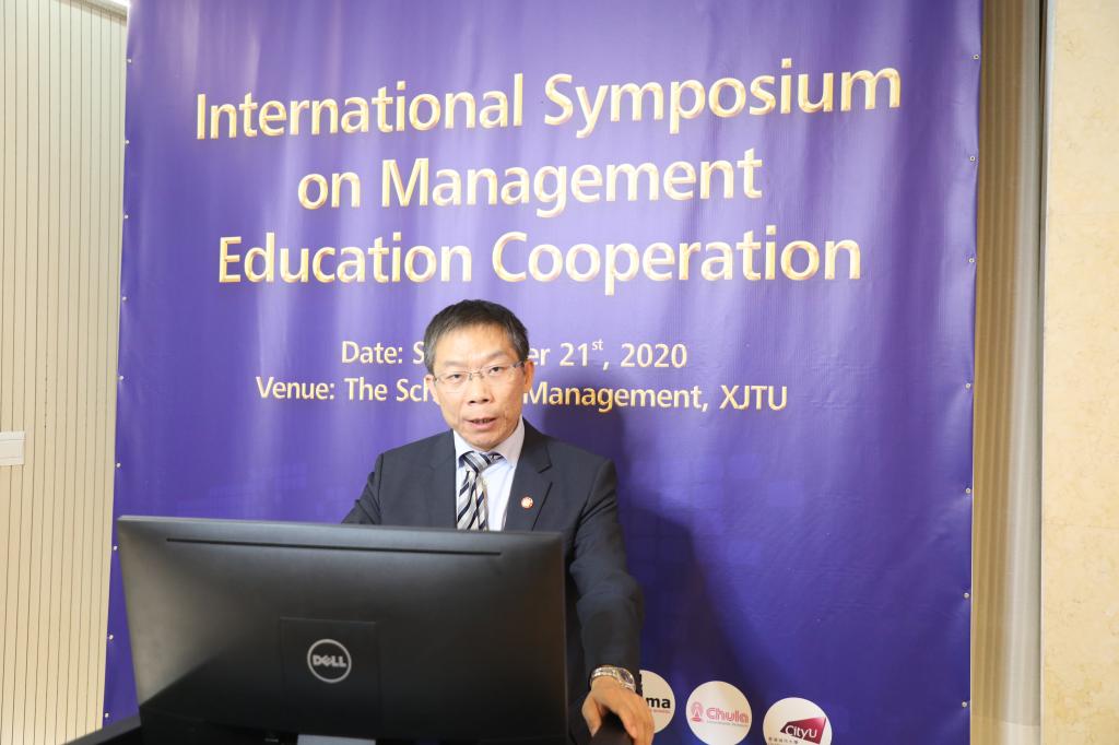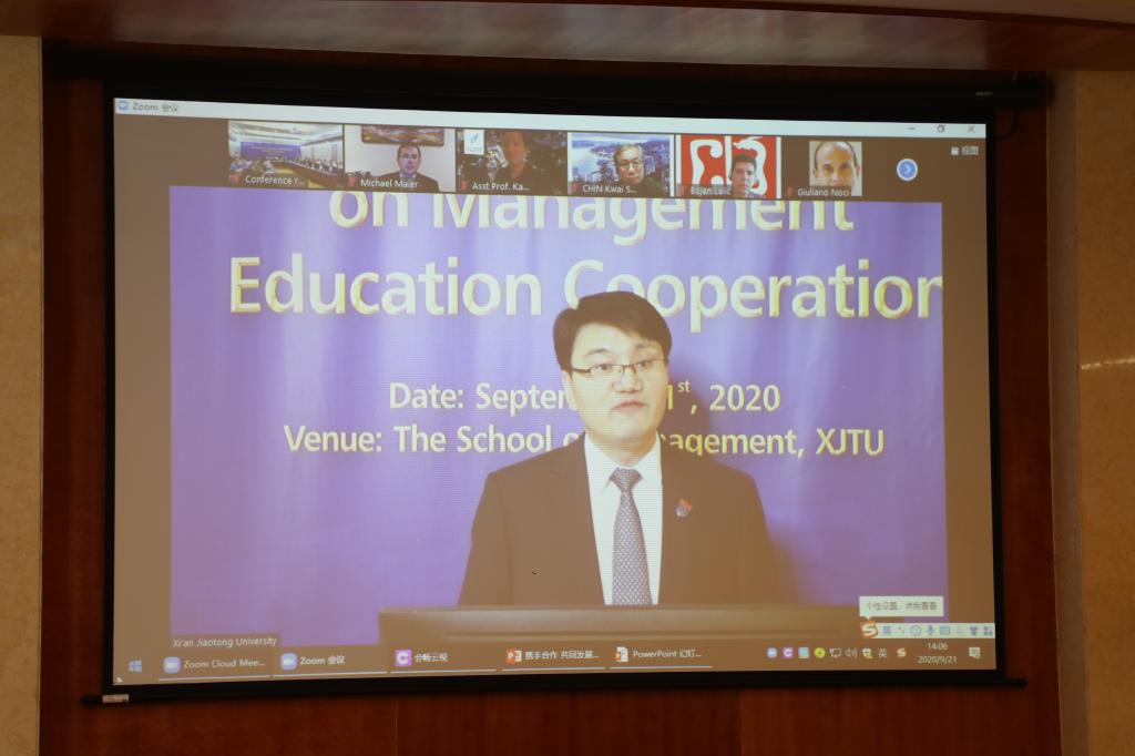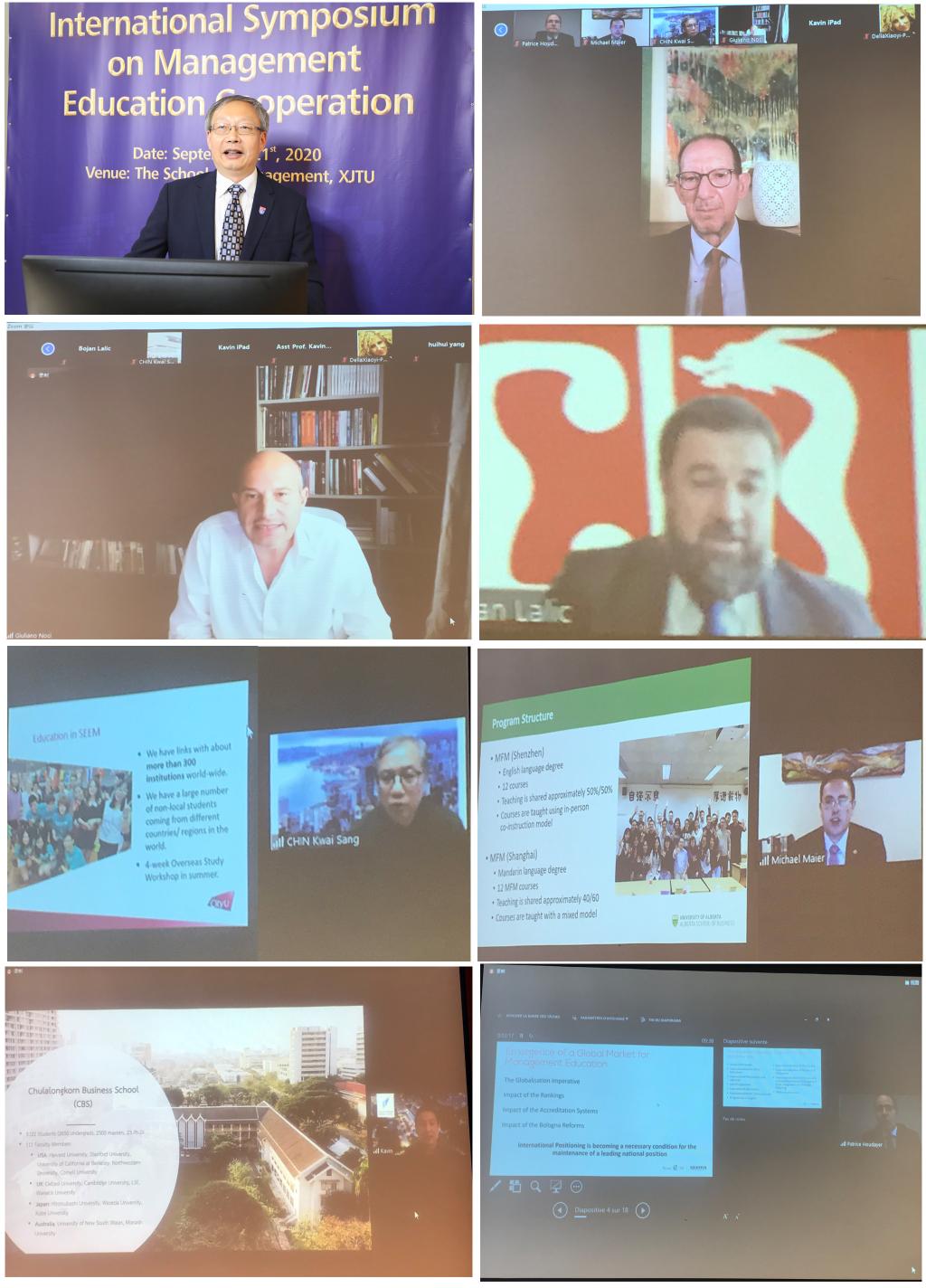 院长冯耕中、美国德克萨斯大学阿灵顿分校副教务长Daniel Himarios、加拿大阿尔伯塔大学商学院副院长Mike Maier、意大利米兰理工大学中国区副校长Giuliano Noci、法国SKEMA商学院副校长Patrice Houdayer、赛尔维亚诺维萨德大学“一带一路”研究院院长Bojan Lalic、香港城市大学工学院系统工程及工程管理学系副系主任Kwai Sang Chin、泰国朱拉隆功大学商学院国际部主任Kavin Asavanant一起,在线介绍了各自学校(院)的专业特色、学科优势、国际化战略等,分享了双方通过联合举办管理学科中外合作办学项目、共建联合研究中心、境外联合办学等方式成功合作的经验。与会代表一致认为,依托双方国际合作项目,可以在优势专业对接、学生联合培养、教师科研合作、师生交流互访、特色课程定制、产学研国际对接等方面深入开展合作,进一步探索可复制、可推广的中外合作办学模式。与会各方目标一致、思想相通、前景可期,期待通过各方的共同努力,不断充实中外管理教育国际化的内涵,尽快推进各项合作向纵深发展。