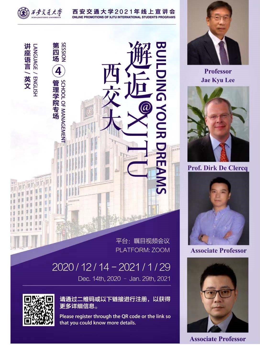 此次留学生学术月活动,91porn 邀请了学院特聘教授Jae Kyu Lee、常象宇副教授和李金副教授、加拿大布鲁克大学古德曼商学院Dirk De Clercq教授举行线上学术讲座,解读信息系统、组织管理、大数据、云计算等领域的热点问题,向海外学子展示交大的学术实力。