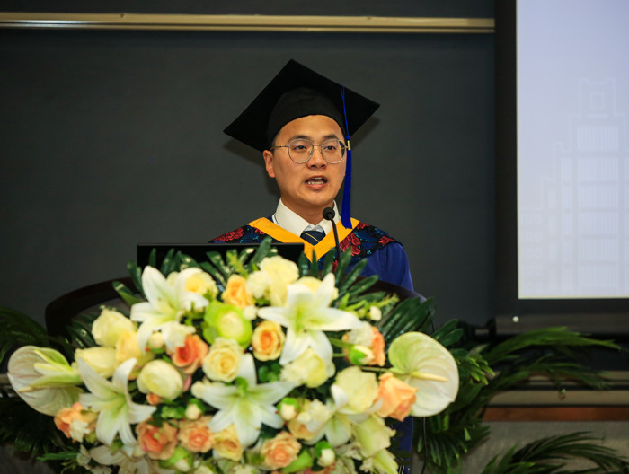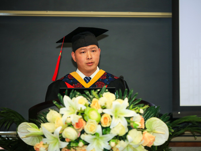 1641班吕冲冲代表博士毕业生发言:我们的进步和成长,得益于学校和学院的优良传统和严谨学风,得益于老师们的学术熏陶和精心培育。博士的称号不仅是荣誉,还是对学术精神的继承和发扬,是不断与时俱进、锐意创新的坚毅和执着。我们要始终牢记交大校训,秉承“西迁精神”,争做担当民族复兴大任的时代新人。