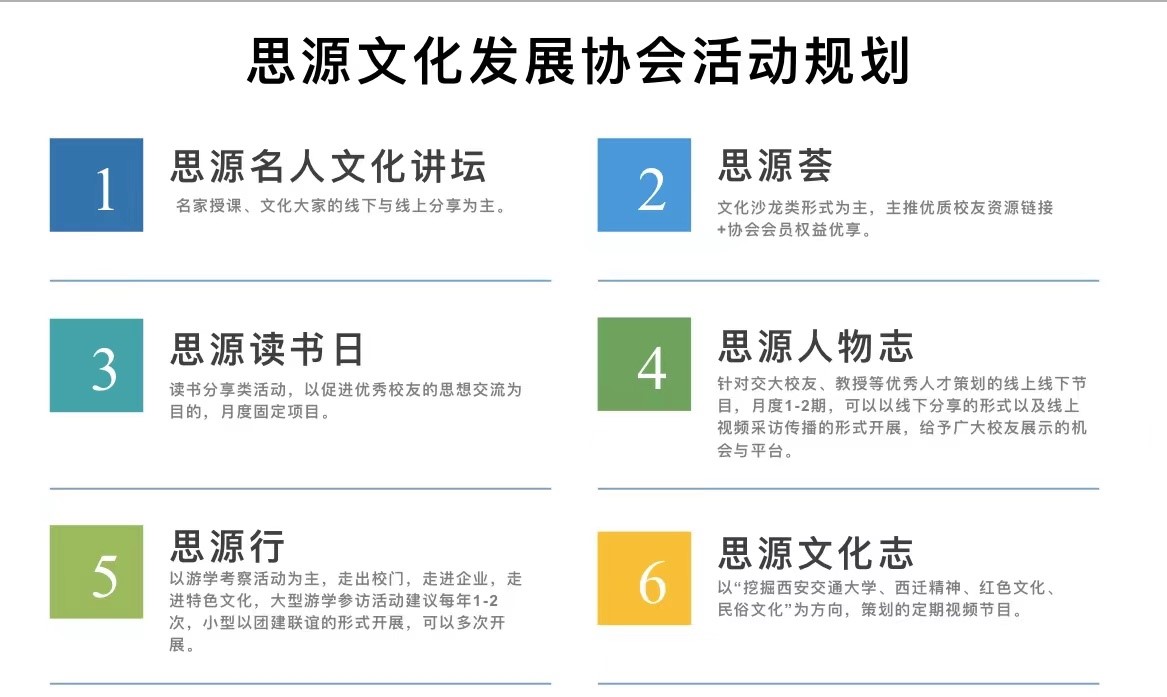 讲座后,思源文化发展协会张凡副秘书长做了思源文化发展协会活动预告,协会将秉承交大西迁精神,充分发挥校友会平台优势,以文化为核心、以精神传承为理念,打造思源名人文化讲坛、思源荟、思源读书日、思源人物志、思源行、思源文化志等核心板块栏目,为校友提供有价值、高品质的文化特色品牌系列活动。