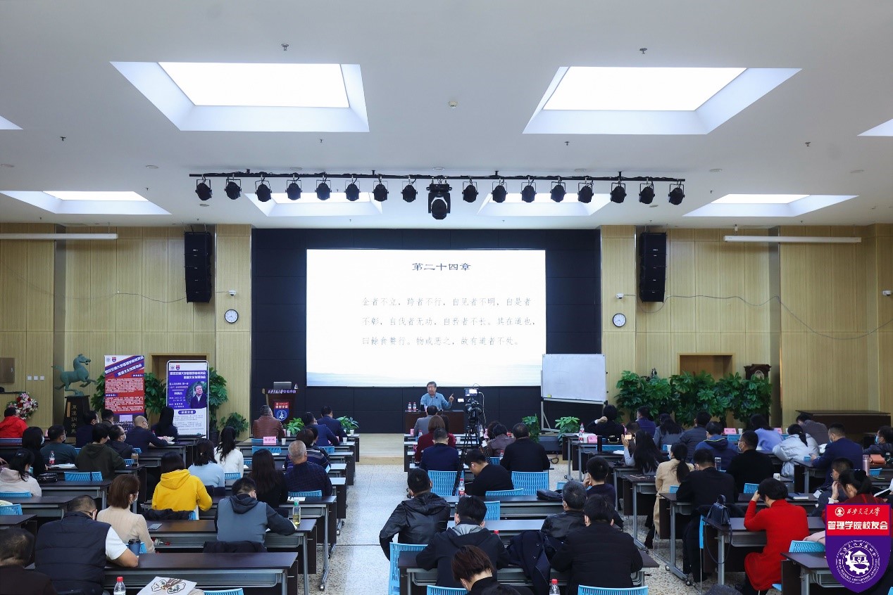 人文学院教授、博士生导师、教工读书会会长韩鹏杰教授做了题为“《老子》的领导管理智慧”的主题讲座。“天之道,利而不害,圣人之道,为而不争”,传统文化的美,在于它的历史,它是圣贤们的智慧积淀,更是千百年来的文明传承。韩教授从“一本书、两个字、三件宝”对中国古代文化典籍《老子》做了生动而深邃的解读,让师生和校友享受了一次中华传统文化畅游之旅和一席文化饕餮盛宴。