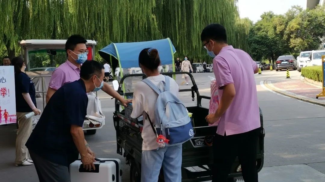 迎新志愿者们认真地核验每一位新生的核酸信息,送上新生专属大礼包。并帮助新同学寻找宿舍、运送行李,关怀备至。老师和志愿者们用热情的笑脸,亲切的问候和贴心的服务,温暖了来自全国各地的莘莘学子。