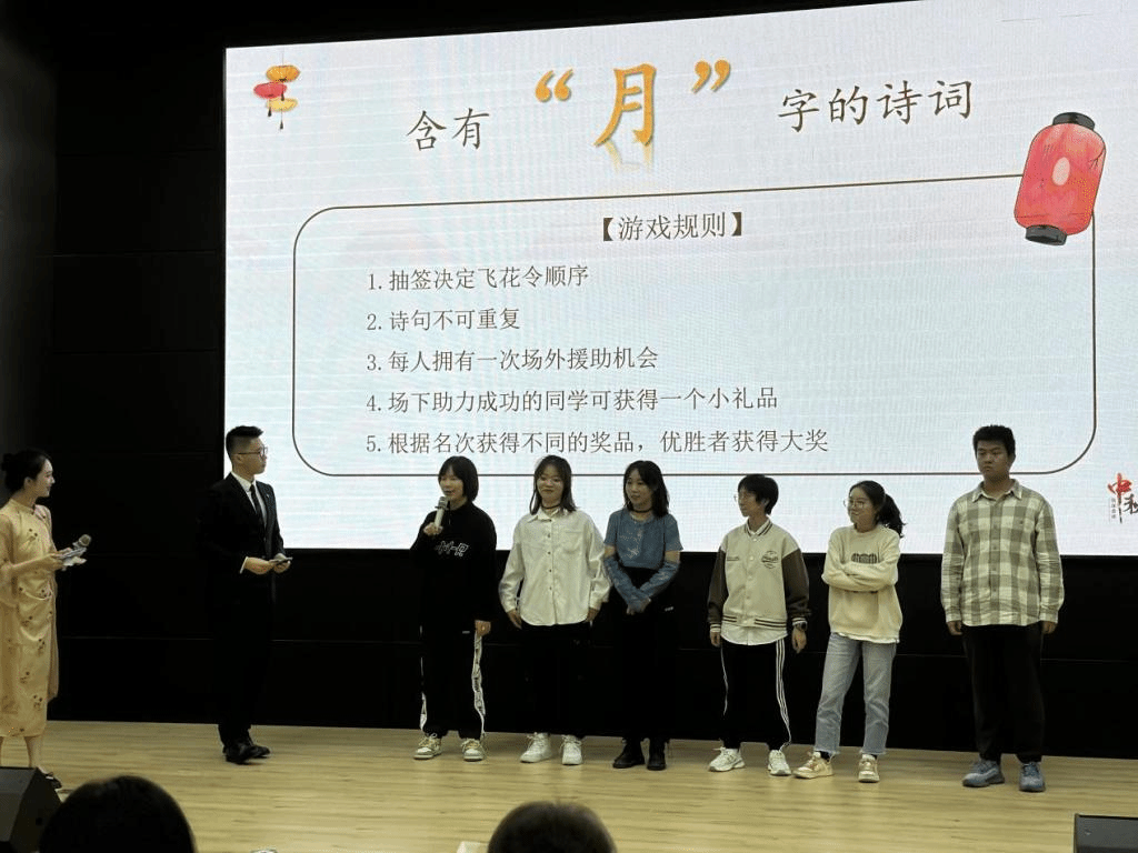 在小游戏“飞花令”的激烈比拼中,管院同学吟诵千古佳句,获得学院准备的按摩仪、手环等奖品。