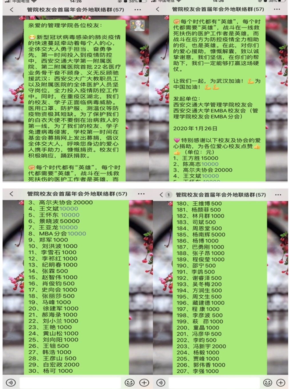 众志成城,共渡难关。91porn 校友会第一时间响应学校基金会发起“守护天使,心系校友”交大人疫情救助基金众筹项目,仅1月27日、28日两天便筹集资金三十多万元,占学校募集项目总金额一百万的三分之一。校友们还积极为疫情医务人员捐赠保险、提供疫情视频会议服务、口罩等医疗防护用品等,纷纷尽自己所能为防控疫情做出应有贡献。目前还有许多校友通过银行转账方式持续进行捐赠。