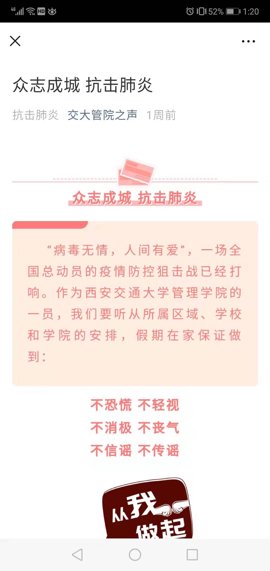 加强宣传教育,引导舆论防疫。利用学院主页、微信平台发布防控信息,向广大师生员工普及科学防控知识,提高师生自我防护意识,引导师生正确认识疫情,理智筛选防控信息,不造谣、不信谣、不传谣,科学做好防护。面对疫情的蔓延,学院首先对师生的恐慌情绪进行安抚。其次,对其接触到一些外媒不真实的报道并在群里发表言论的情况及时回应处理,树立师生对我国政府防治疫情的信心,转发权威媒体的报道,供其了解真实信息,鼓励师生发表正面言论,维护国家与学校的良好形象。