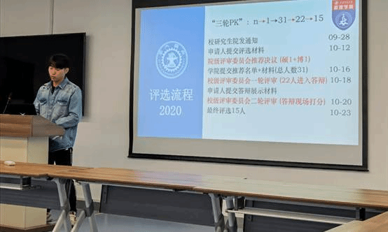 第三个带来分享的是陈匡宇同学。陈匡宇同学课程成绩位列会计专业第一,获得国家奖学金。陈匡宇同学作为班长,详细地讲解了奖学金申请工作,并就研究生生涯规划与研究生期间自我价值实现进行了分享。在保持学业高成绩、top名企实习经历的同时,他还发表了一篇论文。他鼓励同学们认真学习科研、高效规划、团结友爱。