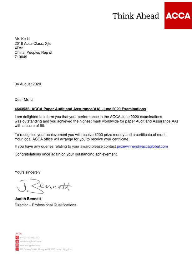 2018级ACCA方向班李珂同学以90分的高分获得F8《审计与认证业务》(Audit and Assurance)课程全球第一名。这也是西安交大开办ACCA方向班以来获得的第8个全球第一。李珂同学还曾在2019年12月考季中获得《财务报告》(Financial Reporting)课程的全球第一。个人连续在两个考季中荣获ACCA单科统考成绩全球第一名,在西安交大ACCA全球统一考试的历史上尚属首次。