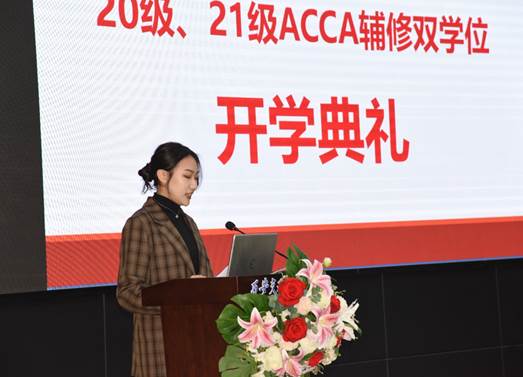 学生代表21级新生张冰雨代表21级ACCA双学位班发言。兴趣使然、期待拓展与提升的初衷让她决定学习ACCA,怀揣热情与梦想更是能够激发学习的潜能。她表示,ACCA学习是人生新的起点,要以此为跳板,像榜样看齐,不断升华;恪守学生准则,共同营造优雅文明的学习环境。知识在于积累,天才在于勤奋,用学习成绩和实践成果检验难忘的岁月,书写无悔青春。