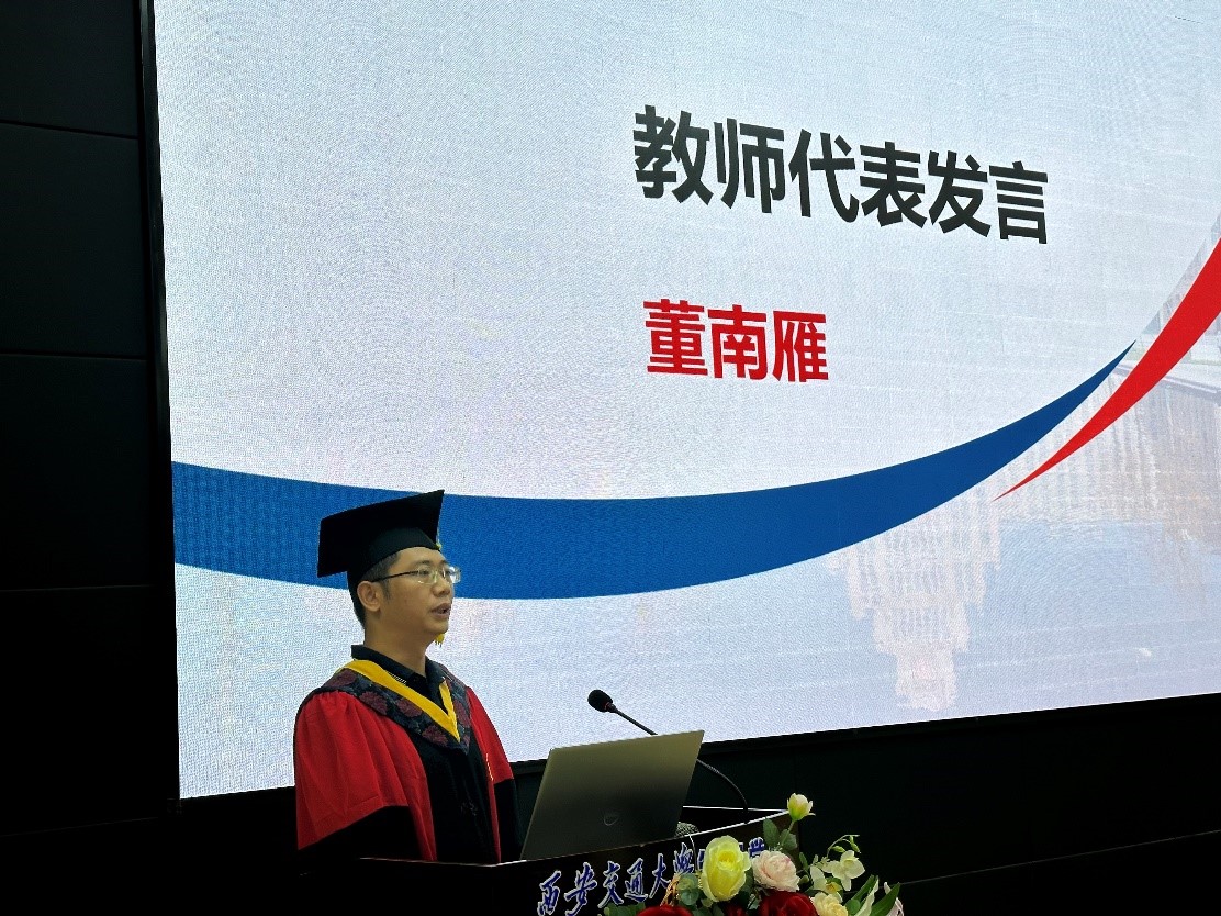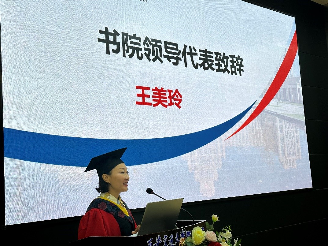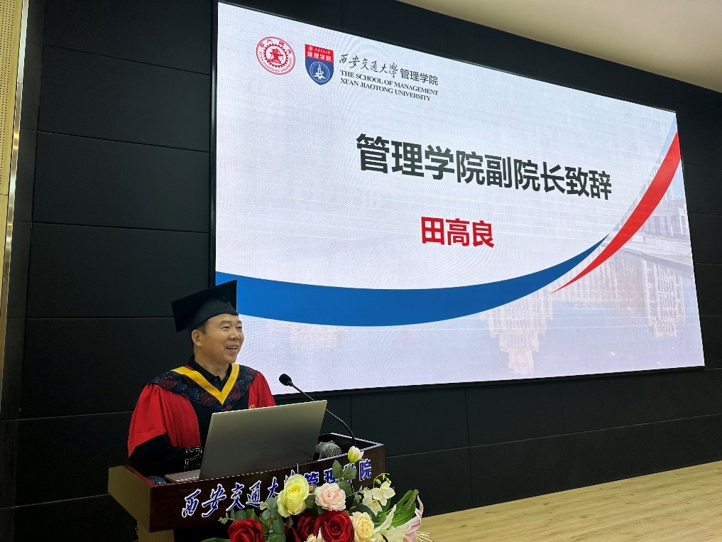 田高良副院长代表学院对19级双学位学子顺利毕业表示祝贺。他以“胸怀国之大志,追求成功人生”为主题寄语学子:第一,在人生战略地图模板上,首先是要能够适应国家战略需求。胸怀国之大者,要有家国情怀。其次,建立赋能战略规划很重要。生态系统科技与专业赋能、要素赋能(充分利用校友资源)、机制赋能(坚持四个面向、个人可持续发展)这几个赋能要素要时刻伴随在今后的学习生活中。第三,要做好人生“增值表”。和身边优秀的人共同探讨“共赢增值表”,“利益相关”最终实现价值最大化,行稳走远。最后,田高良副院长嘱咐学子:作为新时代的交大人,要把交大校训和西迁精神深深烙印在每个人心中,规划好自己的人生,做有价值的事,为世界之光。
