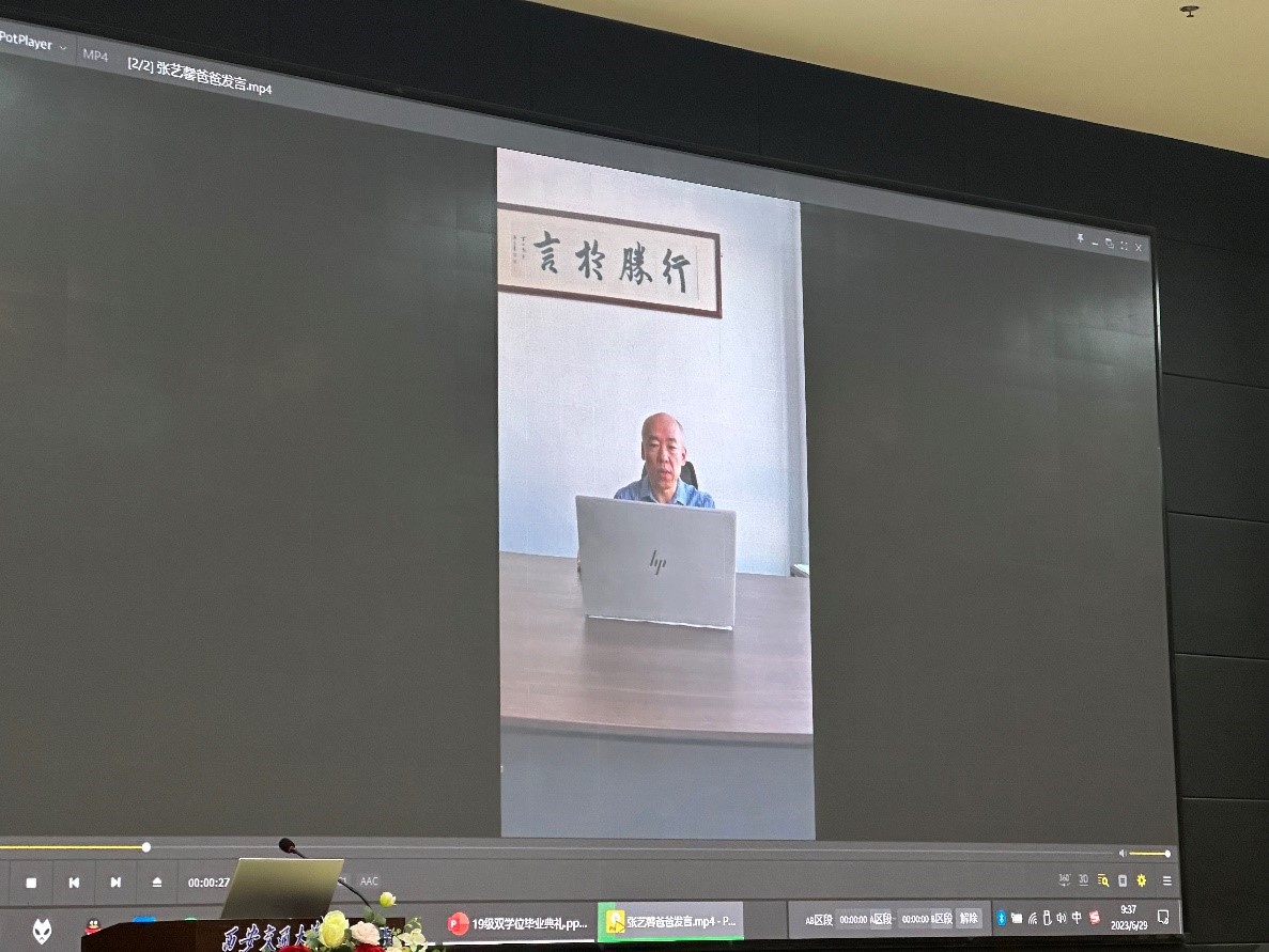 信息管理专业的张长春先生作为家长代表以视频形式发来寄语:他祝贺所有同学,通过四年的不懈努力,圆满完成了学业,获得了人生第一份收获。他希望同学们常怀感恩之心,不忘初心。时间没有绝对的自由,要遵守法律、尊重规则、恪守社会公德。常怀敬畏之心,心中常记“没有规矩、不成方圆”。在今后的学习生活中要团结协作、保持健康的心态,不断进步,牢记母校校训,砥砺前行。祝愿同学们前程似锦。