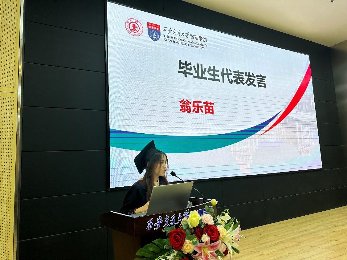 2019级ACCA辅修双学位班翁乐苗同学代表毕业生发言:四年的学习生涯转瞬即逝,心中满怀感激。首先要感谢学校给大家提供复合型知识学习的平台,培养我们要怀有家国情怀;还要感谢学院老师四年里给予专业知识的悉心教诲与栽培,让我们迅速成长成才;更是要感谢自己能够保持初心,保持对知识的热爱,为理想不懈奋斗。最后她祝福母校,祝福学院有更好地发展,祝愿同学们不负青春韶华,前程似锦。